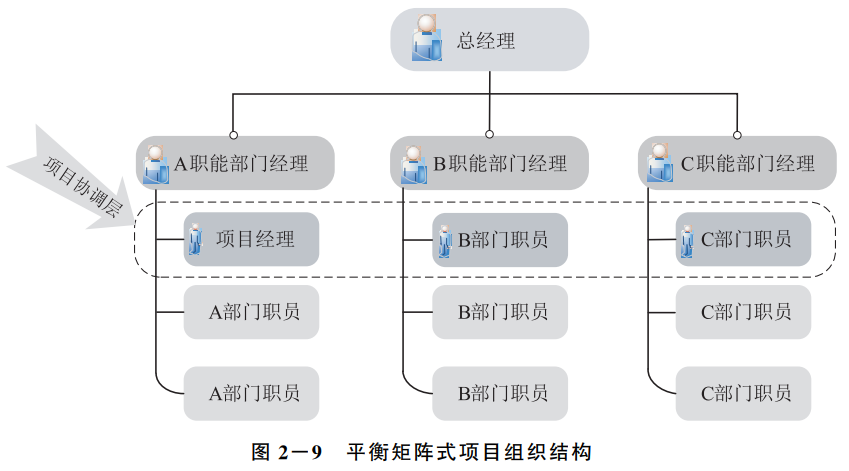 平衡矩阵式项目组织结构拥有正式设立的项目团队,项目经理可以是专职或兼职,其权力比在弱矩阵式组织环境中要大得多。