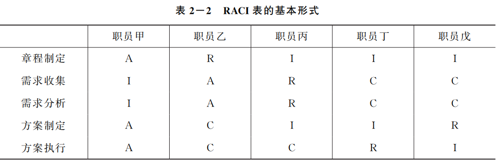 执行者 (Responsible,R)、负责者 (Accountable,A)、咨询者 (Consulted,C)和知情者(Informed,I)